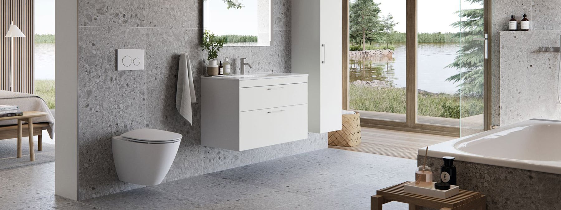 Forestil dig badeværelsesinteriør i nuancer, der nærmest flyder sammen og skaber en følelse af ro og luksus.